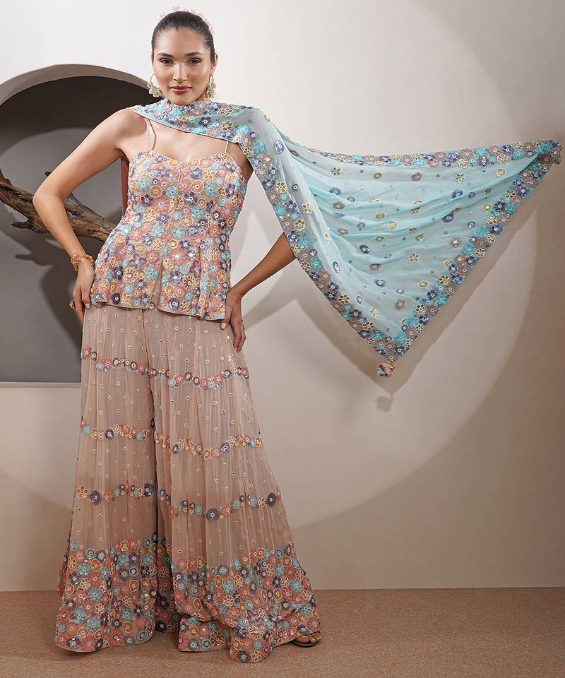 Light Fawn Silk Georgette Sharara Set Stitched
