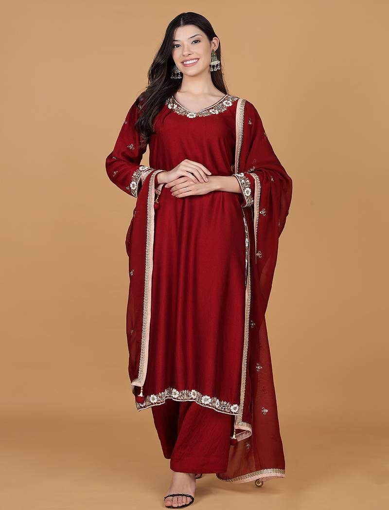 • Product Id : 4679358 • Package Details : 1 Kurta / 1 Palazzo / 1 Dupatta • Type : Kurta Sets • Sleeve : Full Sleeve • Color : Maroon • Fabric : Katan Silk • Work : Cut Dana • Stitching : Stitched Payments [+]