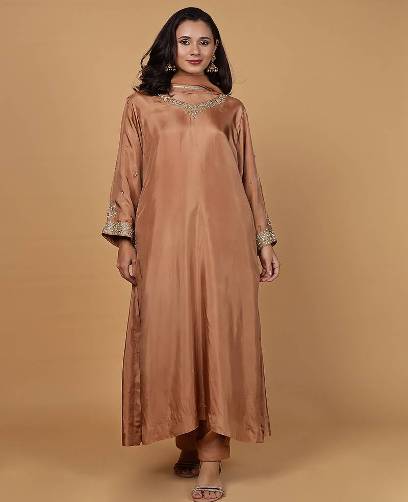 • Product Id : 4679341 • Package Details : 1 Kurta / 1 Pant / 1 Dupatta • Type : Kurta Sets • Sleeve : Full Sleeve • Fabric : Silk • Color : Brown • Work : Cut Dana • Stitching : Stitched Payments [+]