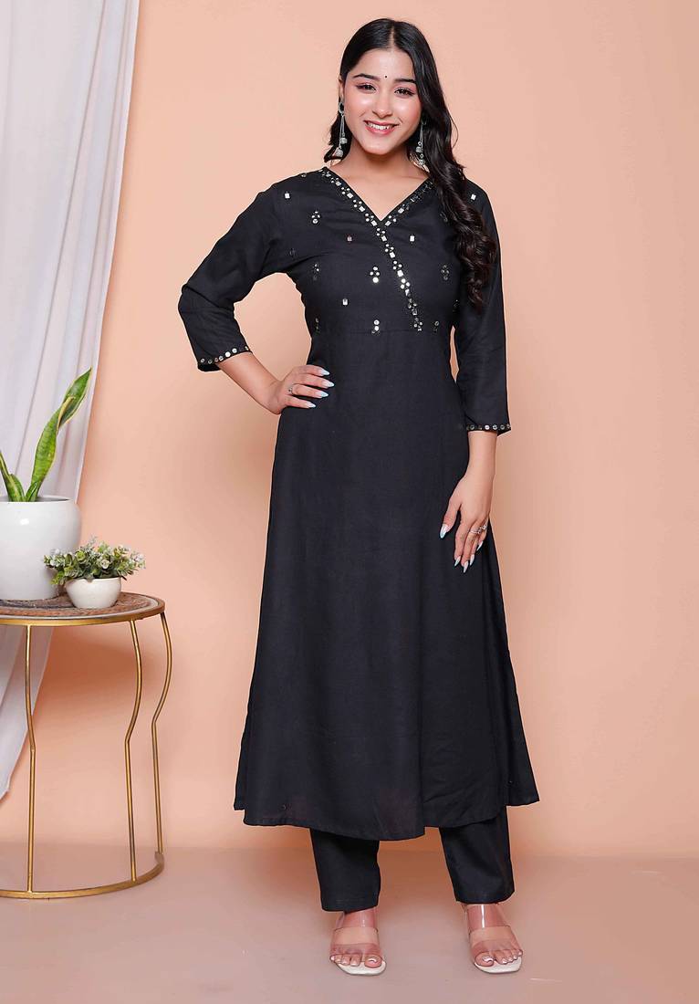 Womens Black Mirror Work Angrakha Kurta And Palazzo Set Stitched