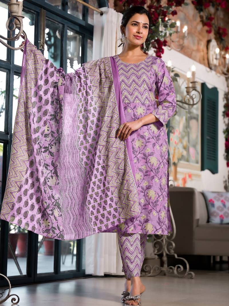 Women's Lavendar Floral Print Pure Cotton Straight Fit Kurta Set With Bottom And Dupatta (3 Piece Set)