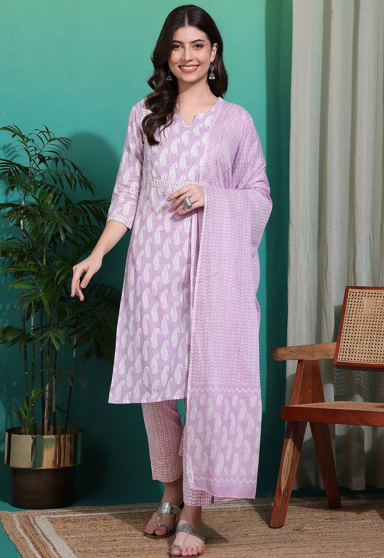 Women's Lavender & White Paisley Sequin Work Pure Cotton Straight Fit Kurta Set With Bottom And Dupatta
