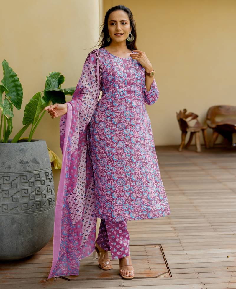 • Product Id : 4715345 • Package Details : 1 Top / 1 Bottom / 1 Dupatta • Type : Kurta Sets • Region : India • Fabric : Cotton • Work : Printed • Type : Floral Print • Look : Fashion • Sleeve : Quarter Sleeve • Neck Style : Round Neck • Color : Magenta • Stitching : Stitched • Length : 45.0 Stitching [+]