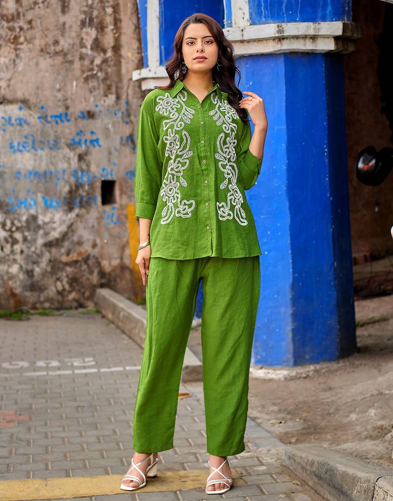 • Product Id : 4710408 • Package Details : 1 Shirt / 1pent • Type : Kurtis • Occasion : Casual • Fabric : Crepe • Work : Embroidered • Look : Designer • Sleeve : Quarter Sleeve • Color : Parrot Green • Stitching : Stitched • Neck Style : Stylised Neck Payments [+]