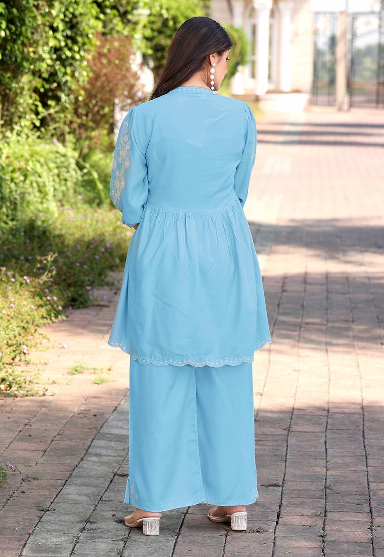 • Product Id : 4699139 • Package Details : 1 Kurta/ 1palazzo • Type : Kurta Sets • Occasion : Casual • Fabric : Rayon • Work : Embroidered • Look : Designer • Sleeve : Quarter Sleeve • Neck Style : V Neck • Color : Blue • Stitching : Stitched Payments [+]
