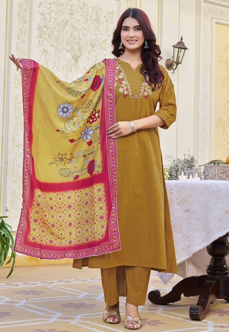 • Product Id : 4675341 • Package Details : 1 Kurta/ 1pant / 1dupatta • Type : Kurta Sets • Occasion : Casual • Fabric : Cotton • Work : Embroidered • Look : Designer • Sleeve : Quarter Sleeve • Neck Style : V Neck • Color : Yellow • Stitching : Stitched Payments [+]