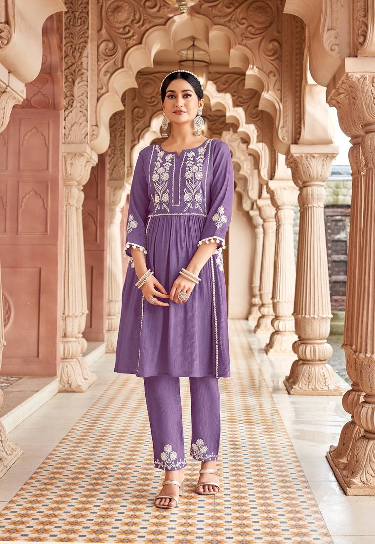 • Product Id : 4672626 • Package Details : 1 Kurta/ 1pent • Type : Kurtis • Occasion : Casual • Fabric : Viscose Rayon • Work : Embroidered • Look : Designer • Sleeve : Quarter Sleeve • Neck Style : V Neck • Color : Purple • Stitching : Stitched Payments [+]