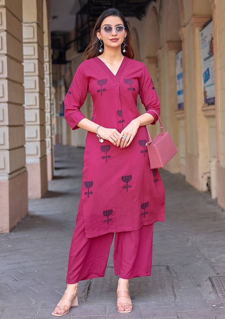 • Product Id : 4697880 • Package Details : 1 Kurta/ 1palazzo • Type : Kurta Sets • Occasion : Casual • Fabric : Rayon • Work : Embroidered • Look : Designer • Sleeve : Quarter Sleeve • Neck Style : V Neck • Color : Pink • Stitching : Stitched Payments [+]