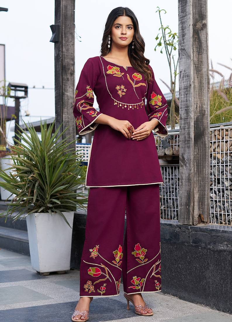 • Product Id : 4715321 • Package Details : 1 Top / 1pent • Type : Kurtis • Occasion : Casual • Fabric : Cotton • Work : Embroidered • Look : Designer • Sleeve : Quarter Sleeve • Color : Rani Pink • Stitching : Stitched Payments [+]