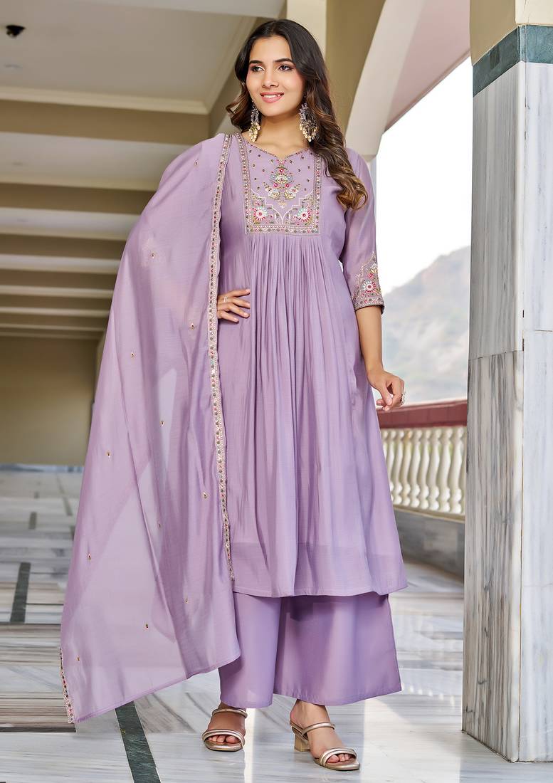 • Product Id : 4706653 • Package Details : 1 Kurta/ 1pant / 1dupatta • Type : Kurta Sets • Occasion : Casual • Fabric : Chanderi • Work : Embroidered • Look : Designer • Sleeve : Quarter Sleeve • Neck Style : Round Neck • Color : Purple • Stitching : Stitched Payments [+]