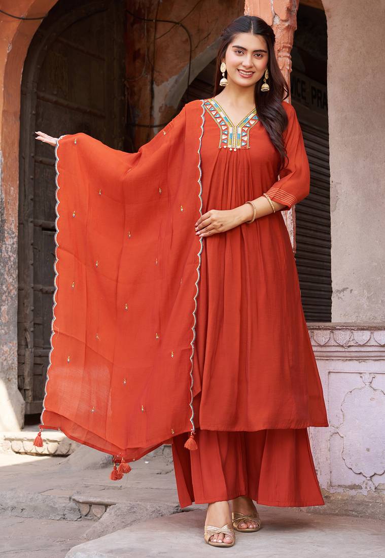 • Product Id : 4715338 • Package Details : 1 Kurta/ 1palazzo / 1dupatta • Type : Kurtis • Occasion : Casual • Fabric : Chanderi • Work : Embroidered • Look : Designer • Sleeve : Quarter Sleeve • Neck Style : Round Neck • Color : Orange • Stitching : Stitched Payments [+]