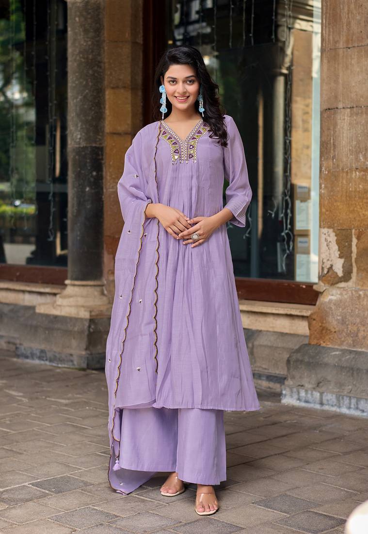 • Product Id : 4720966 • Package Details : 1 Kurta/ 1palazzo / 1dupatta • Type : Kurta Sets • Occasion : Casual • Fabric : Chanderi • Work : Embroidered • Look : Designer • Sleeve : Quarter Sleeve • Neck Style : Round Neck • Color : Purple • Stitching : Stitched Payments [+]