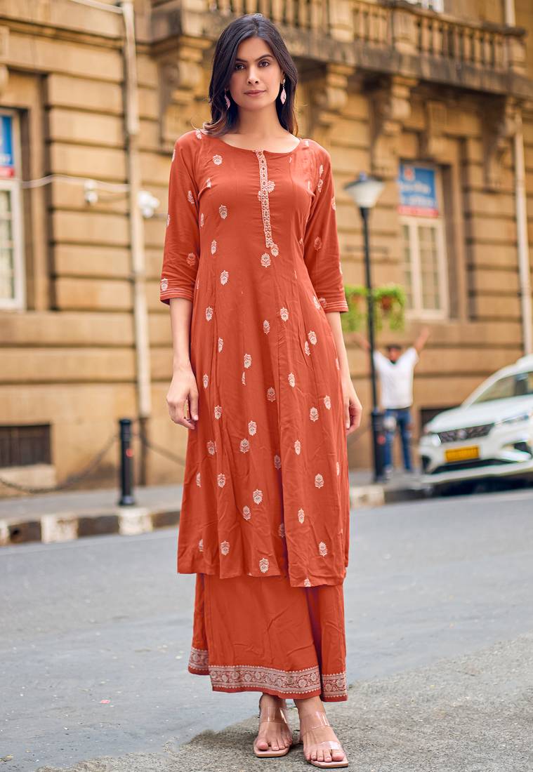 • Product Id : 4670303 • Package Details : 1 Kurta/ 1palazzo • Type : Kurtis • Occasion : Casual • Fabric : Rayon • Work : Printed • Look : Designer • Sleeve : Quarter Sleeve • Neck Style : Round Neck • Color : Orange • Stitching : Stitched Payments [+]