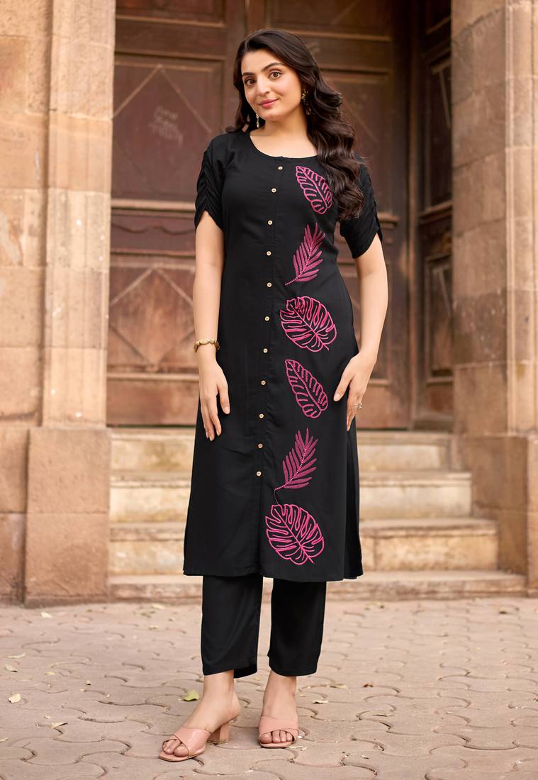 • Product Id : 4706671 • Package Details : 1 Kurta/ 1pant • Type : Kurta Sets • Occasion : Casual • Fabric : Rayon • Work : Embroidered • Look : Designer • Sleeve : Quarter Sleeve • Neck Style : Round Neck • Color : Black • Stitching : Stitched Payments [+]