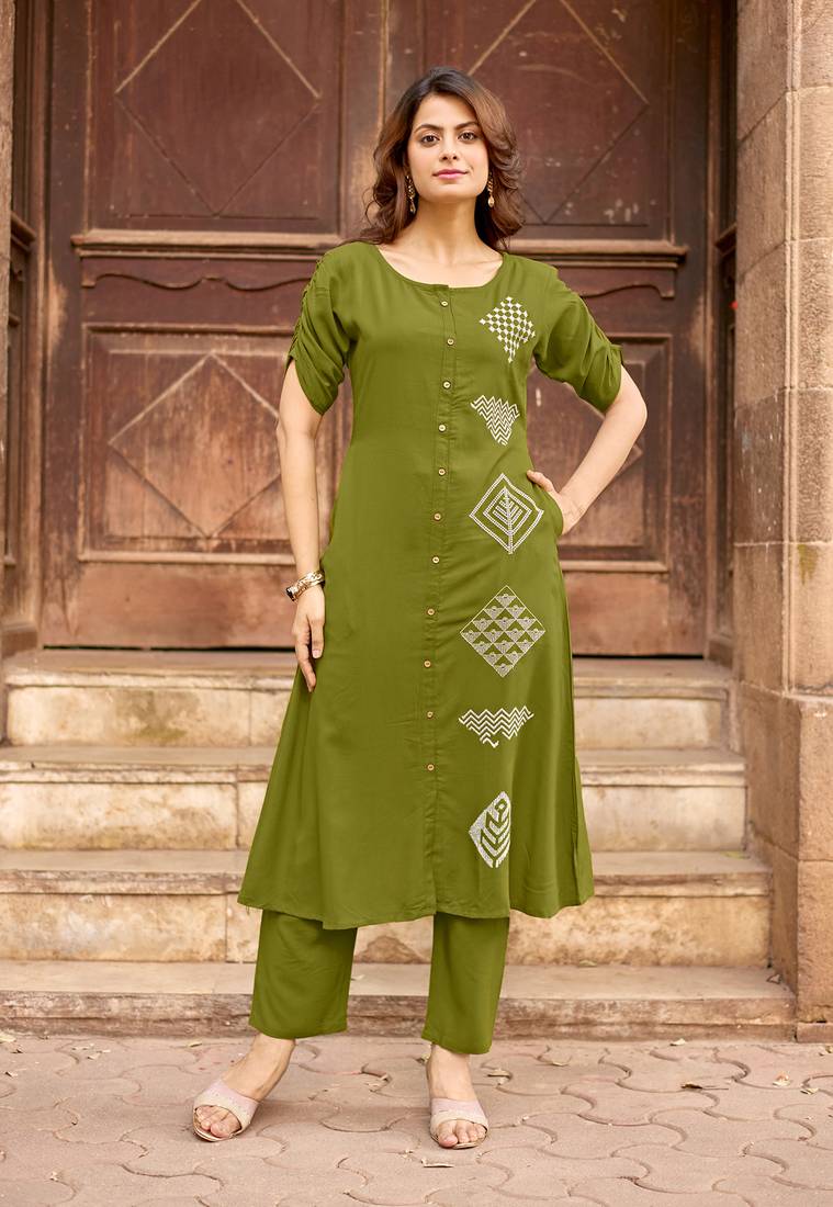 • Product Id : 4706669 • Package Details : 1 Kurta/ 1pant • Type : Kurta Sets • Occasion : Casual • Fabric : Rayon • Work : Embroidered • Look : Designer • Sleeve : Quarter Sleeve • Neck Style : Round Neck • Color : Parrot Green • Stitching : Stitched Stitching [+]