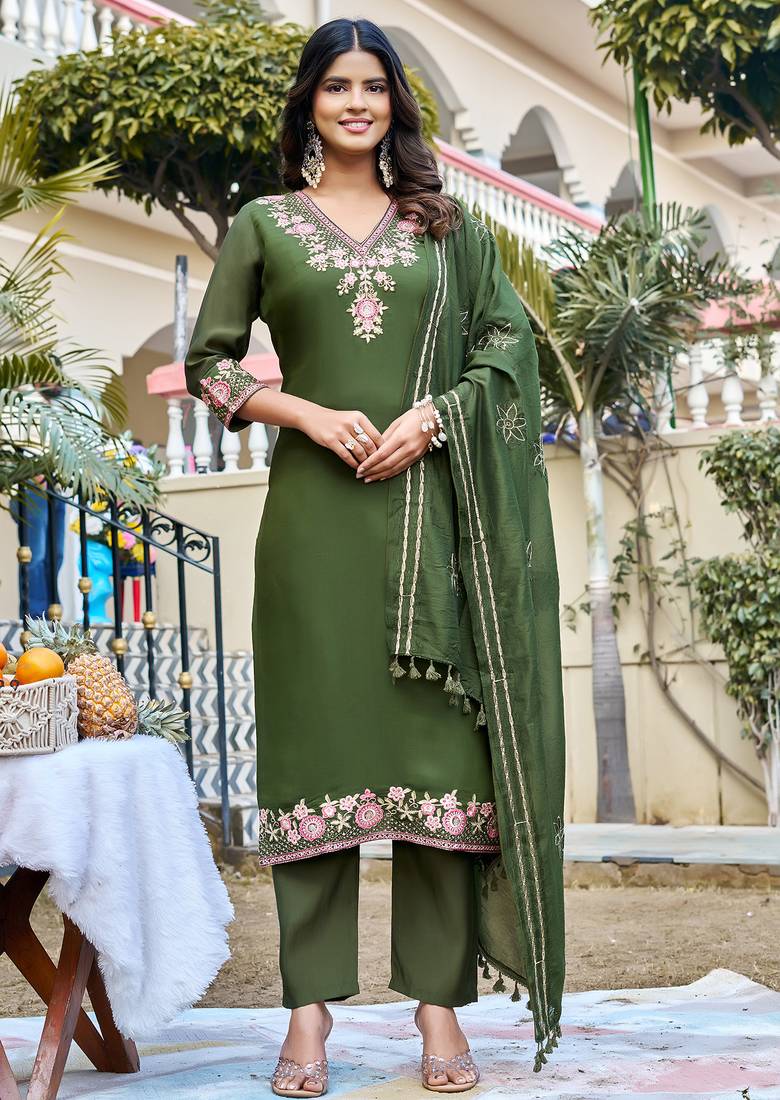• Product Id : 4706081 • Package Details : 1 Kurta/ 1pant / 1dupatta • Type : Kurta Sets • Occasion : Casual • Fabric : Chanderi • Work : Embroidered • Look : Designer • Sleeve : Quarter Sleeve • Neck Style : V Neck • Color : Green • Stitching : Stitched Payments [+]