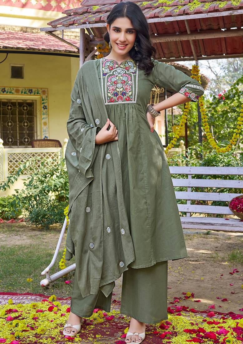• Product Id : 4706261 • Package Details : 1 Kurta/ 1pant / 1dupatta • Type : Kurta Sets • Occasion : Casual • Fabric : Cotton • Work : Embroidered • Look : Designer • Sleeve : Quarter Sleeve • Neck Style : V Neck • Color : Green • Stitching : Stitched Payments [+]