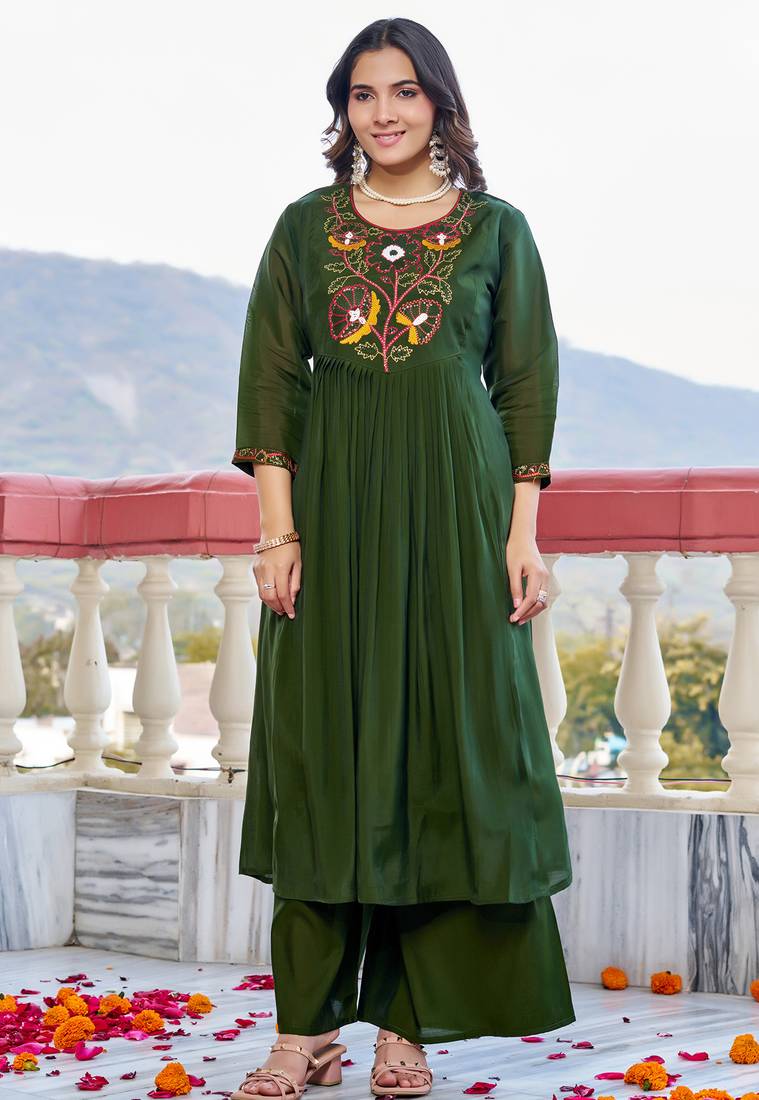 • Product Id : 4706636 • Package Details : 1 Kurta/ 1pant / 1dupatta • Type : Kurta Sets • Occasion : Casual • Fabric : Chanderi • Work : Embroidered • Look : Designer • Sleeve : Quarter Sleeve • Neck Style : Round Neck • Color : Green • Stitching : Stitched Payments [+]