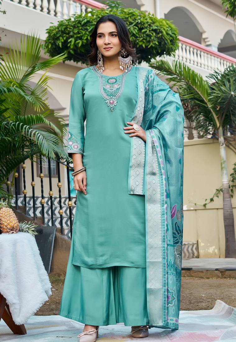• Product Id : 4706611 • Package Details : 1 Kurta/ 1pant / 1dupatta • Type : Kurta Sets • Occasion : Casual • Fabric : Cotton • Work : Embroidered • Look : Designer • Sleeve : Quarter Sleeve • Neck Style : Round Neck • Color : Sky Blue • Stitching : Stitched Payments [+]