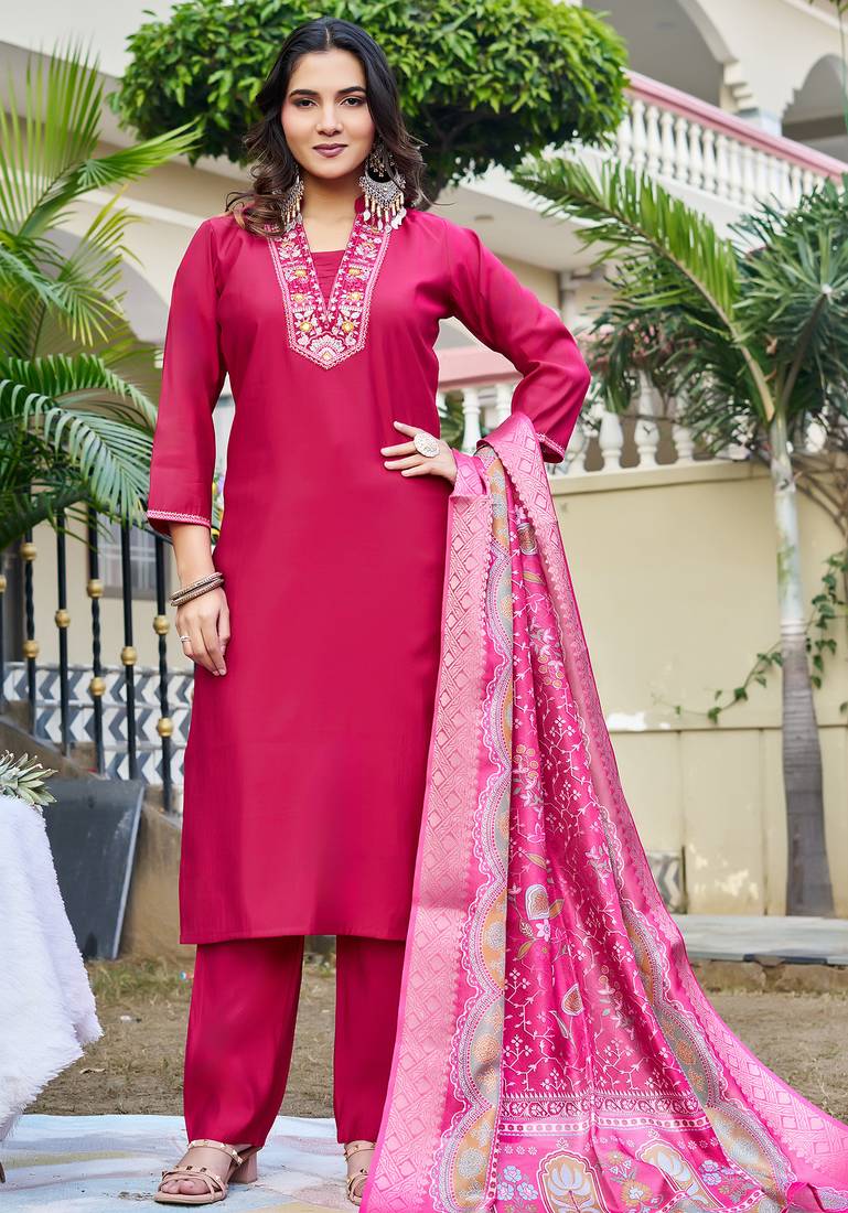 • Product Id : 4706623 • Package Details : 1 Kurta/ 1pant / 1dupatta • Type : Kurta Sets • Occasion : Casual • Fabric : Silk • Work : Embroidered • Look : Designer • Sleeve : Quarter Sleeve • Neck Style : V Neck • Color : Pink • Stitching : Stitched Payments [+]