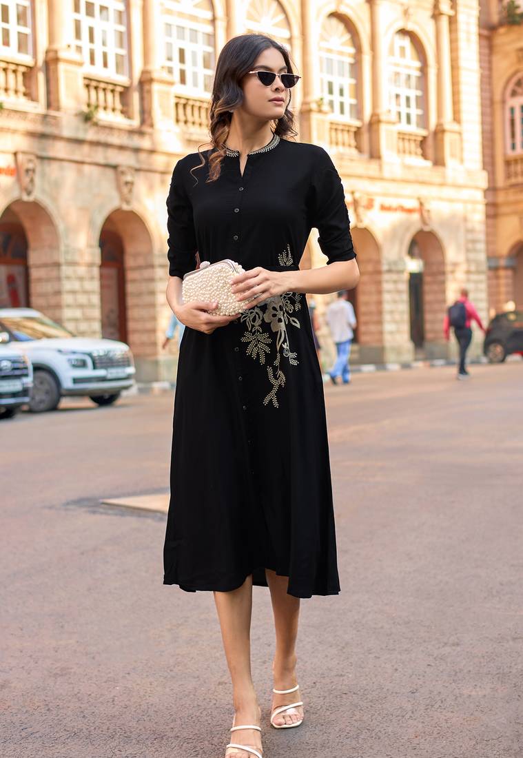 • Product Id : 4680361 • Package Details : 1 Kurti • Type : Kurtis • Occasion : Casual • Fabric : Rayon • Work : Embroidered • Look : Designer • Sleeve : Quarter Sleeve • Neck Style : V Neck • Color : Black • Stitching : Stitched Payments [+]