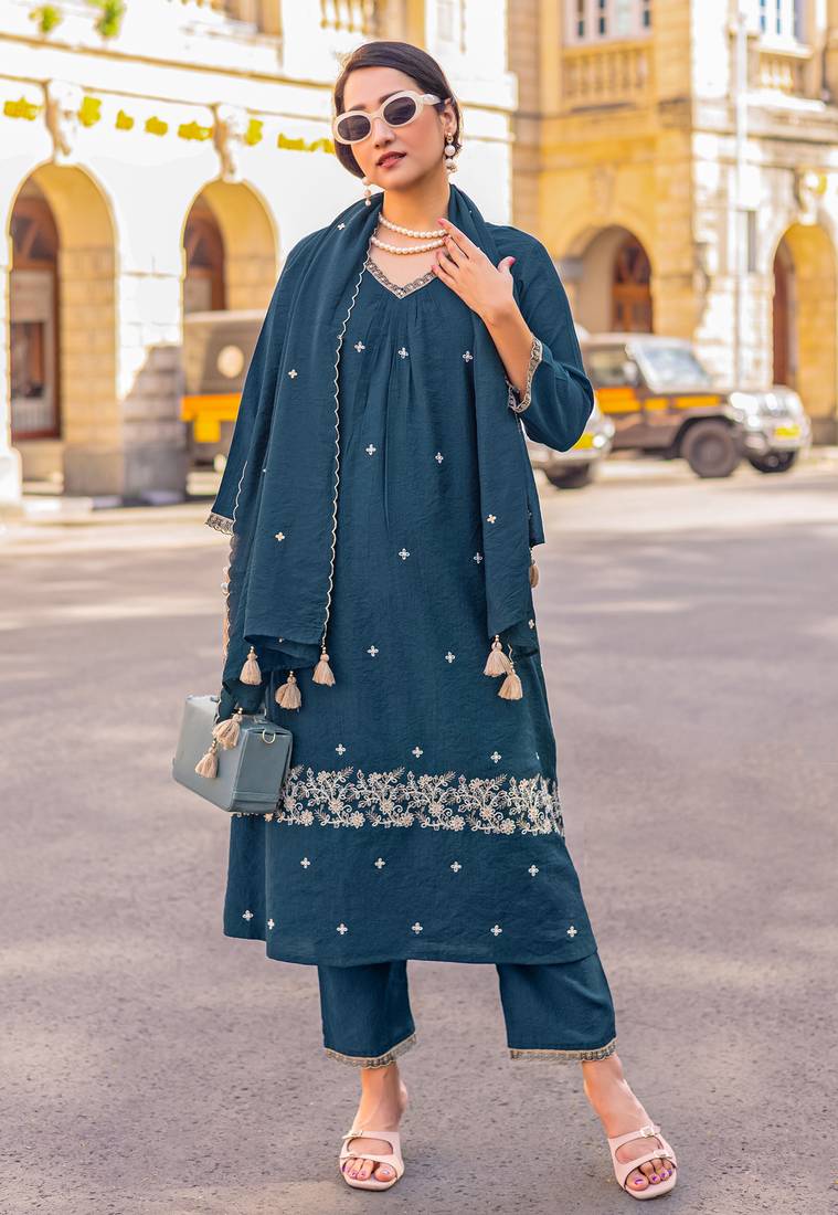 • Product Id : 4664449 • Package Details : 1 Kurta/ 1pent / 1dupatta • Type : Kurtis • Occasion : Casual • Fabric : Rayon • Work : Embroidered • Look : Designer • Sleeve : Quarter Sleeve • Neck Style : V Neck • Color : Teal • Stitching : Stitched Payments [+]