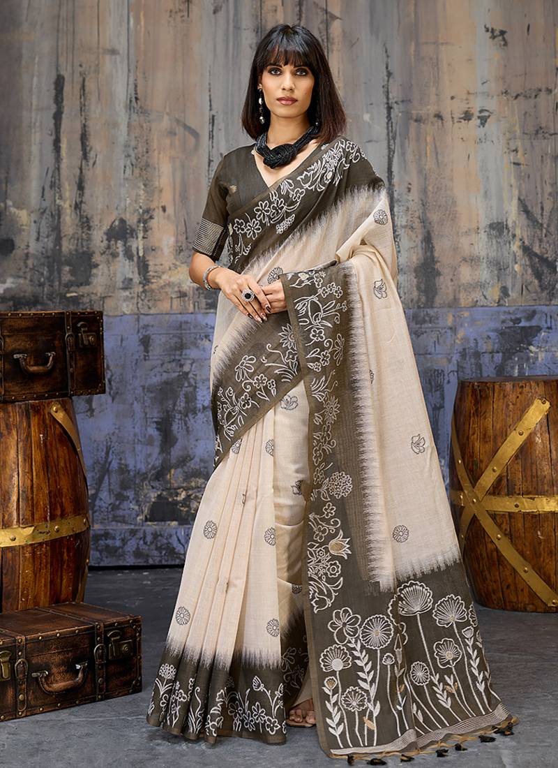 Cotton Blend Cream & Black Saree