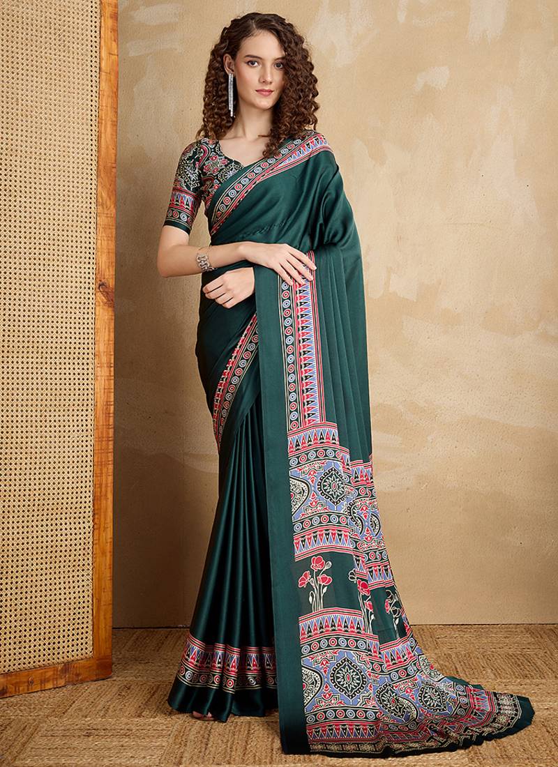 Exude refined charm with this dark green satin saree, featuring vibrant multi-colored prints border & pallu. The smooth satin fabric offers a soft sheen and elegant drape, adds a bold and stylish touch. Perfect for festive occasions, cocktail events, or daytime celebrations, this saree beautifully balances sophistication with a hint of glamour. Awarded as the Most Trusted Brand, we're delivering styles you love, just as promised. Comes with unstiched blouse. (Slight variation in color, fabric & work is possible. Model images are only representative.)