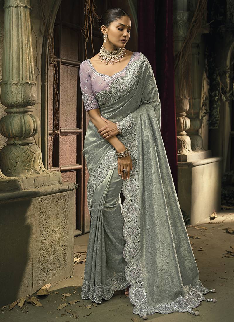 Grey Silk Blend Wedding Saree With Cut Dana, Embroidered, Moti And Zari Work