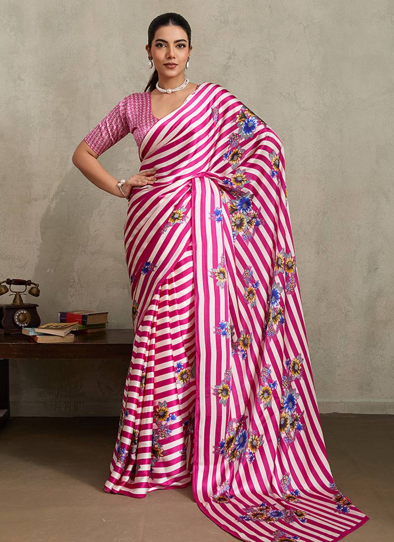 Hot Pink colored saree enhanced with beautiful strips and floral print as shown, giving it a refined and stylish look. Crafted from modal satin fabric for a soft and breathable feel. Includes a modal satin blouse piece which you can customize as per your design/style. Suitable for party and functions. (Slight variation in color, fabric & work is possible. Model images are only representative.)