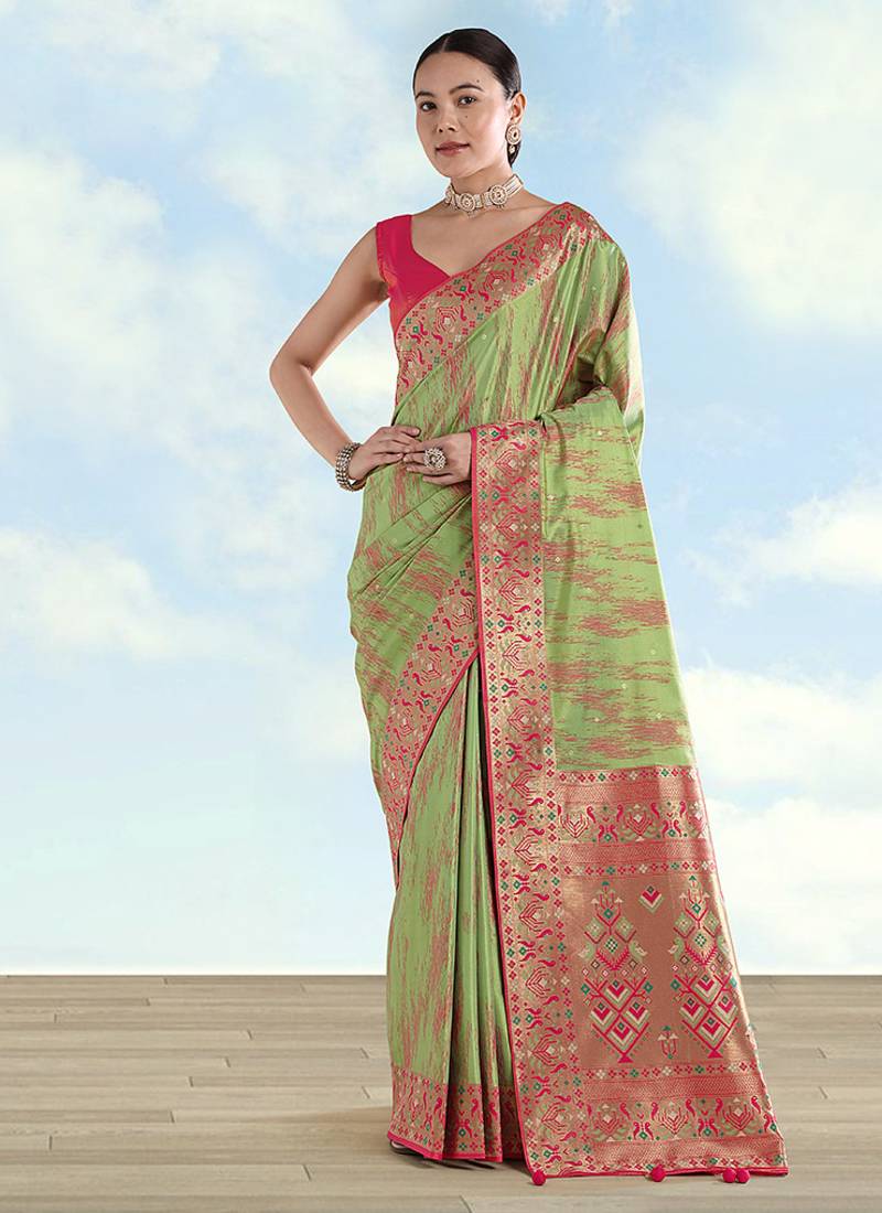• Saree : Color- Light Green / Fabric- Faux Tissue • Blouse : Color- Rani Pink / Fabric- Faux Tissue Saree Details
