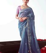 Light Indigo Embroidered Cut Work Fancy Fabric Ceremonial Designer Saree