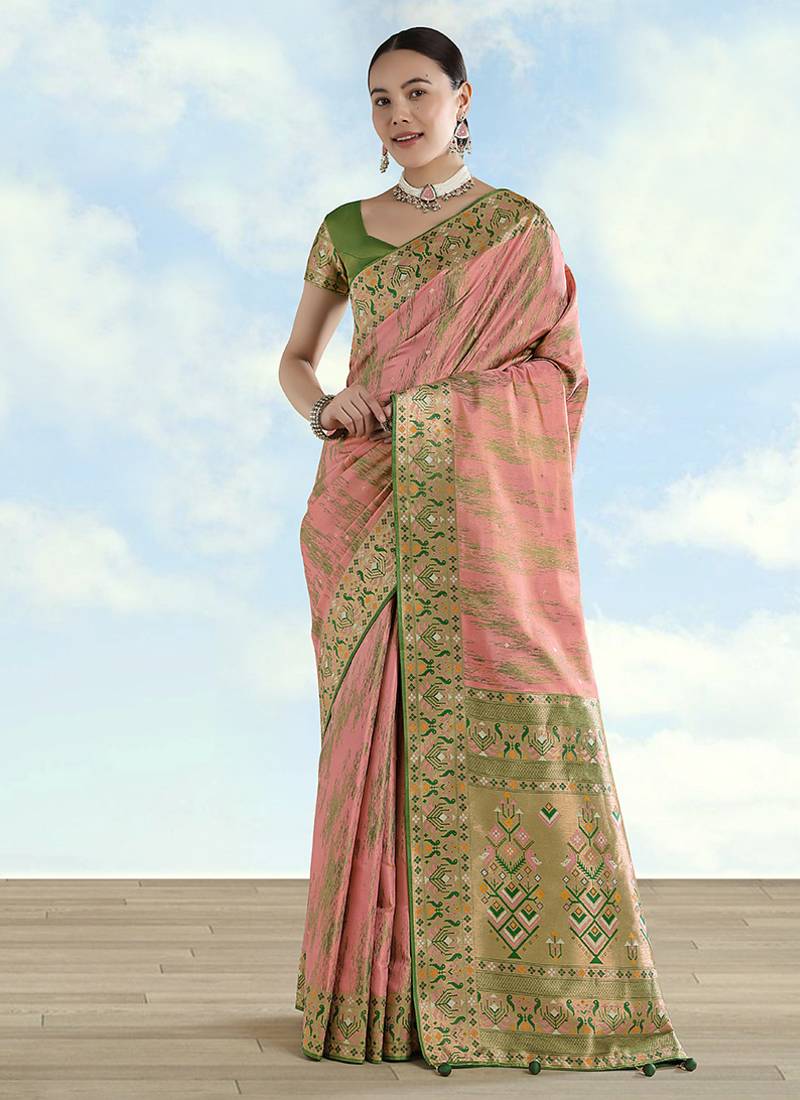 Drape yourself in timeless elegance with this Light Pink color Faux Banarasi Tissue Paithani silk saree, adorned with a beautifully woven zari border and pallu. The luxurious sheen of the Faux Banarasi tissue silk blouse shiny fabric, combined with the intricate zari craftsmanship, makes it a standout piece for weddings and festive celebrations.