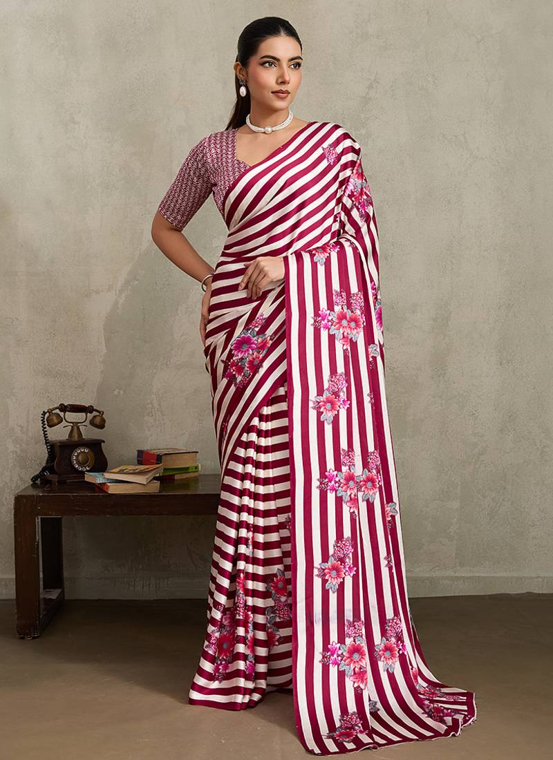 Maroon colored saree enhanced with beautiful strips and floral print as shown, giving it a refined and stylish look. Crafted from modal satin fabric for a soft and breathable feel. Includes a modal satin blouse piece which you can customize as per your design/style. Suitable for party and functions. (Slight variation in color, fabric & work is possible. Model images are only representative.)