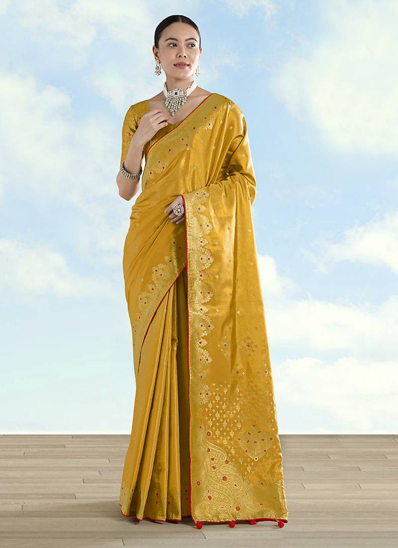 Mustard Color Paisley Zari Woven Faux Banarasi Tissue Silk Saree