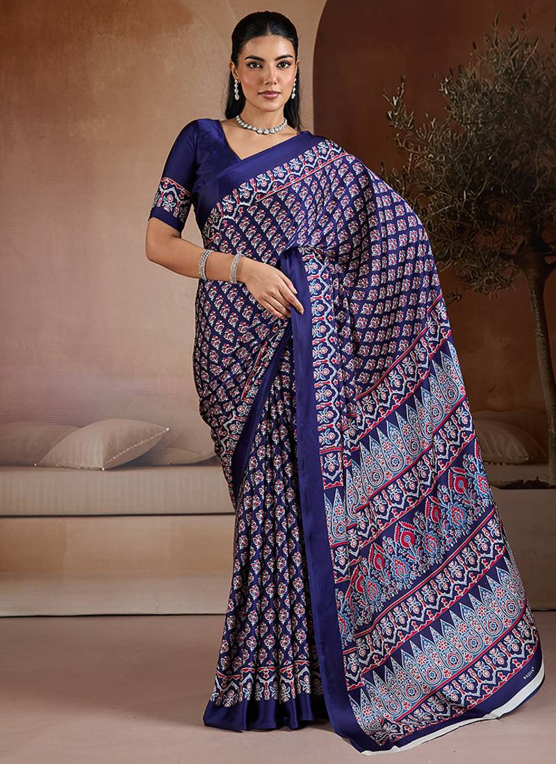 Navy blue satin saree like this one is brought to life through Ajrakh hand block printing work. The plain border and geometric pallu nod to age-old techniques while keeping the design quietly detailed. Awarded as the Most Trusted Brand, we're delivering styles you love, just as promised. Comes with unstiched blouse. (Slight variation in color, fabric & work is possible. Model images are only representative.)