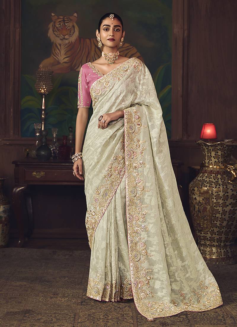 Elegant off white silk saree paired with a contrasting pink blouse adorned with zari and stone detailing. Features traditional zari weaving combined with sequins and stone embellishment for regal appeal. Ideal for weddings, festive gatherings, or reception events. Comes with unstiched blouse. (Slight variation in color, fabric & work is possible. Model images are only representative.)