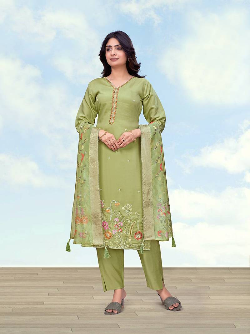Parrot Green Roman Simar Embroidered Work Kurta Set Stitched
