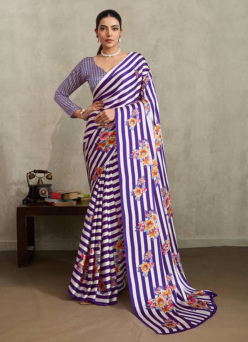 Purple colored saree enhanced with beautiful strips and floral print as shown, giving it a refined and stylish look. Crafted from modal satin fabric for a soft and breathable feel. Includes a modal satin blouse piece which you can customize as per your design/style. Suitable for party and functions. (Slight variation in color, fabric & work is possible. Model images are only representative.)