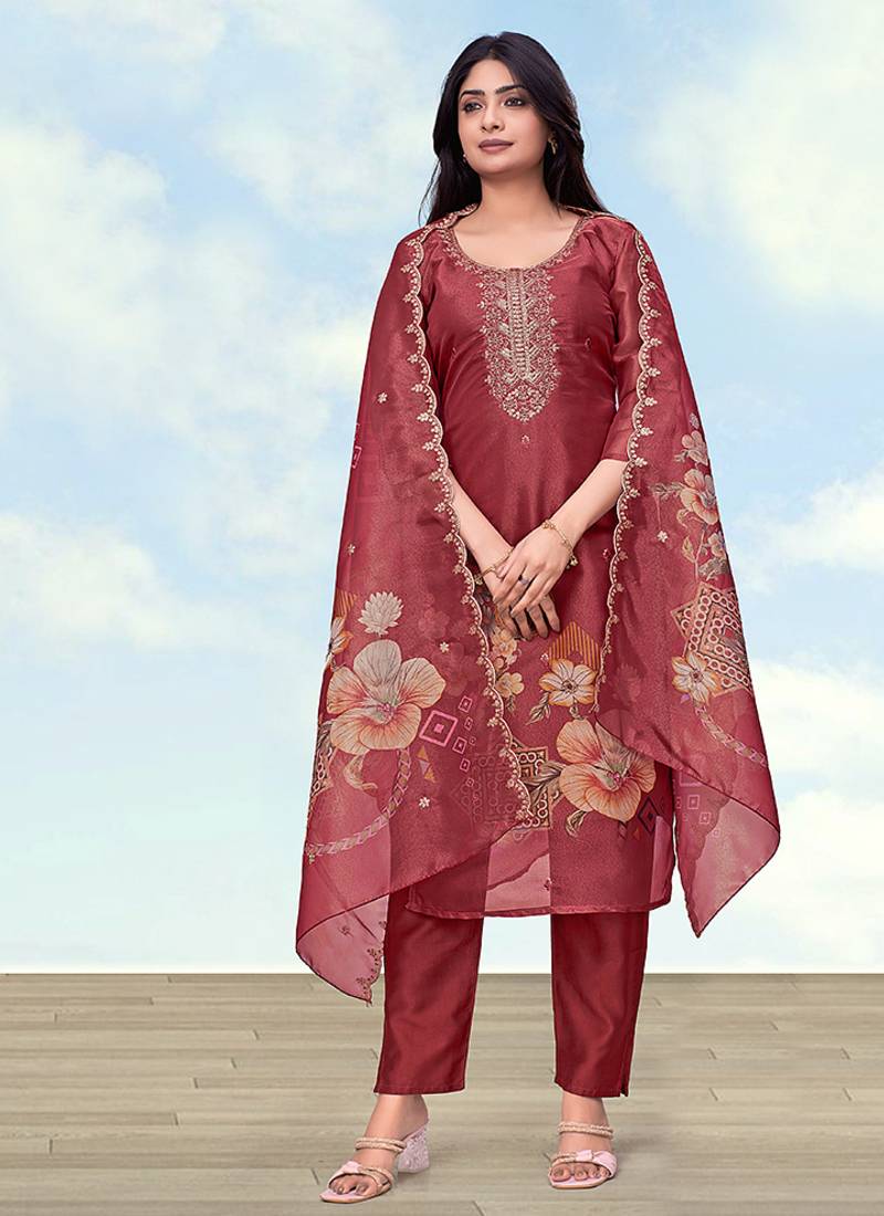 Rust Red Simar Kurta Set With Floral Print Stitched