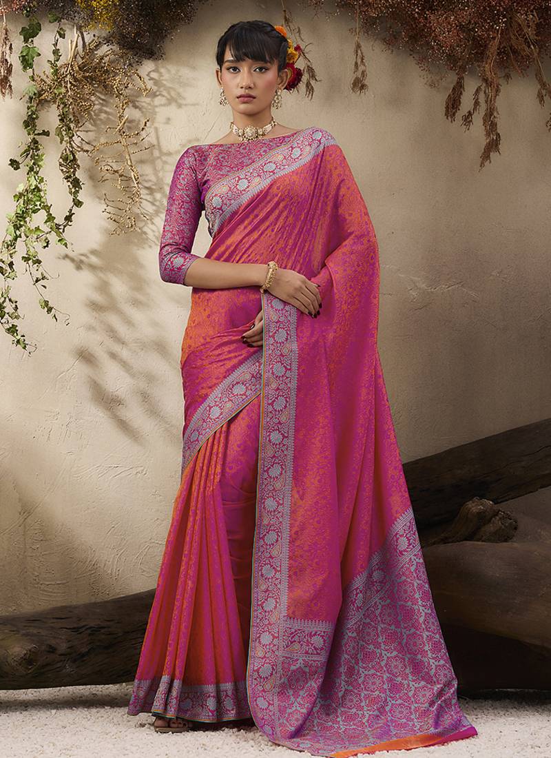 We have ensemble a symphony of enchanting piece to restyle your senses. Make an adorable statement in such a smashy salmon kanjivaram silk blend trendy saree. This desirable attire is showing some remarkable weaving work. Comes with unstiched blouse. (Slight variation in color, fabric & work is possible. Model images are only representative.)