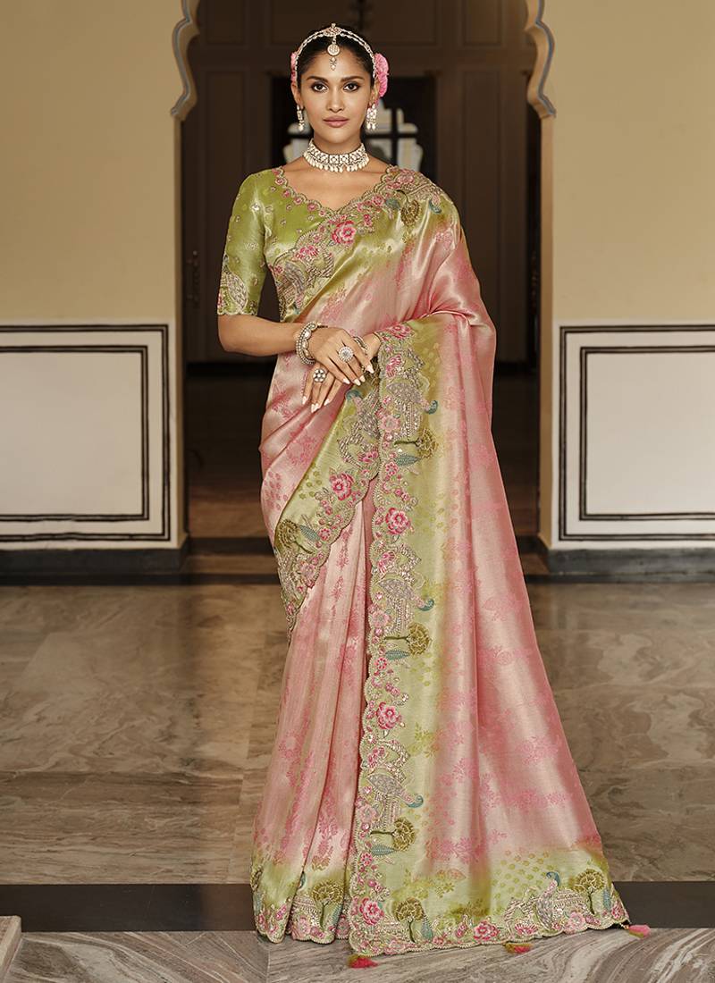 Silk Blend Saree In Pastel Pink & Green With Floral Meenakari Zari Work