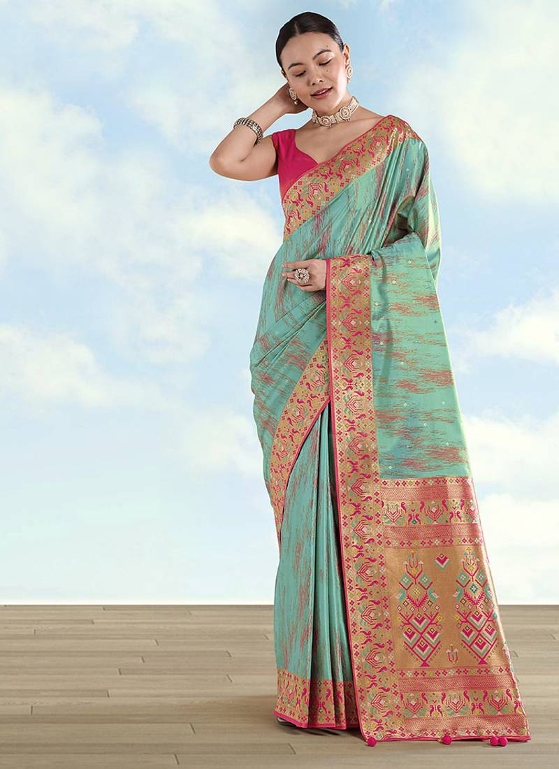 Drape yourself in timeless elegance with this sky blue color Faux Banarasi Tissue Paithani silk saree, adorned with a beautifully woven zari border and pallu. The luxurious sheen of the Faux Banarasi tissue silk blouse shiny fabric, combined with the intricate zari craftsmanship, makes it a standout piece for weddings and festive celebrations.