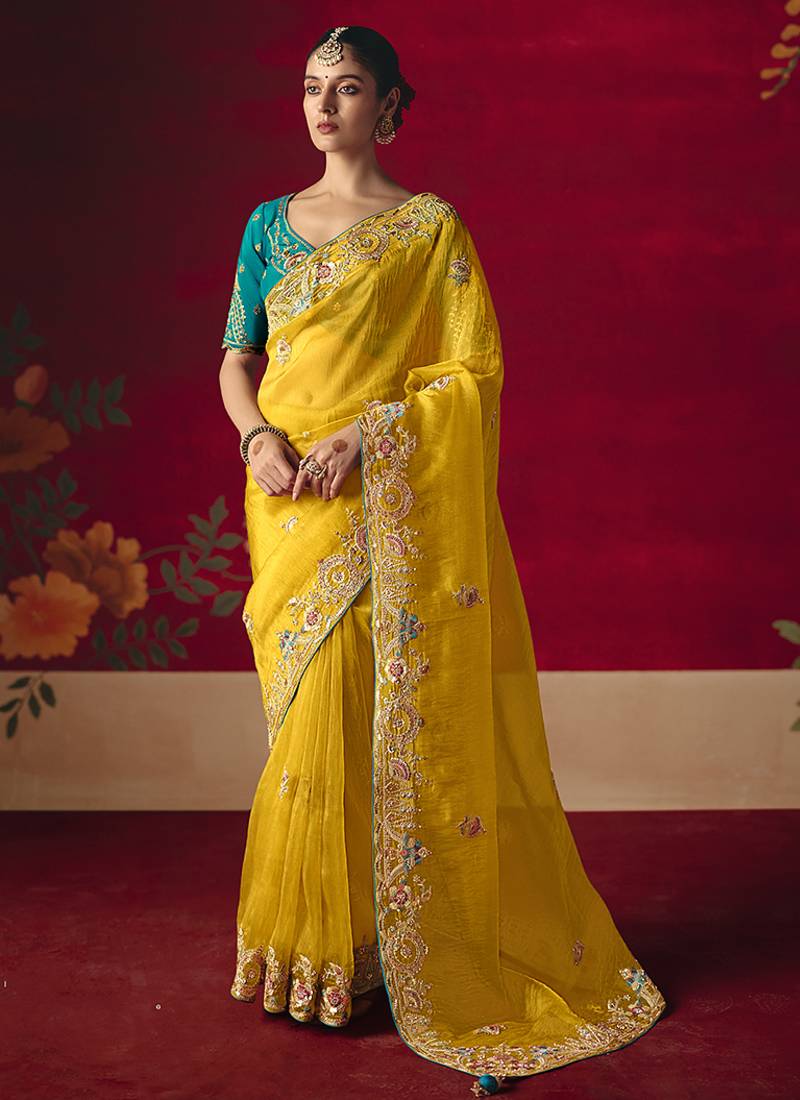 • Saree : Color- Yellow / Fabric- Silk Blend • Blouse : Color- Turquoise / Fabric- Silk Blend Saree Details