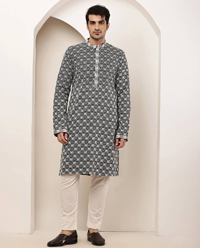 Men’s Black & White Embroidered Kurta Set