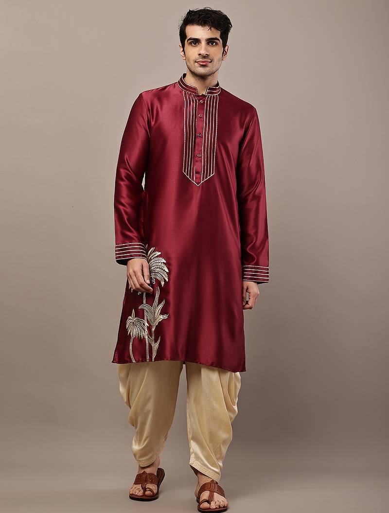 Men’s Maroon Embroidered Kurta With Contrast Threadwork & Decorative Motif