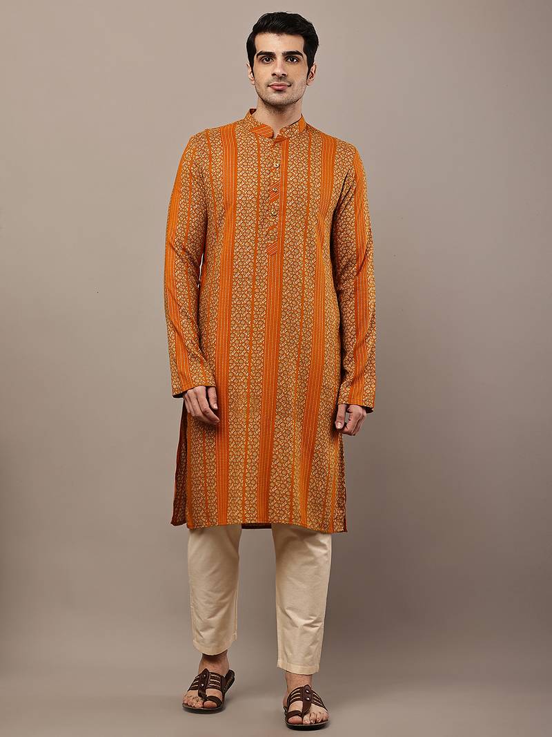 Men’s Mustard Textured Threadwork Kurta