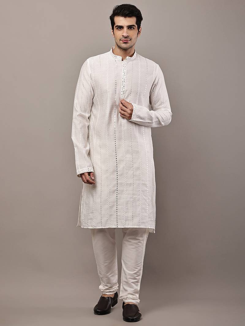 Men’s White Textured Embroidered Kurta