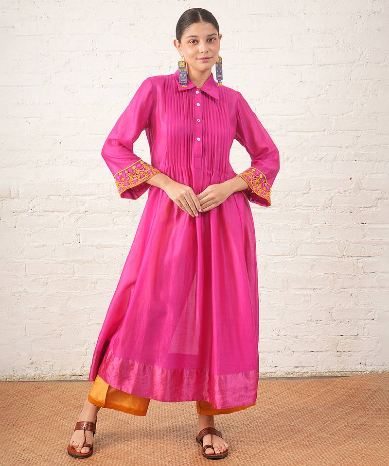 Fuchsia Pink Embroidered Chanderi Kurta Set