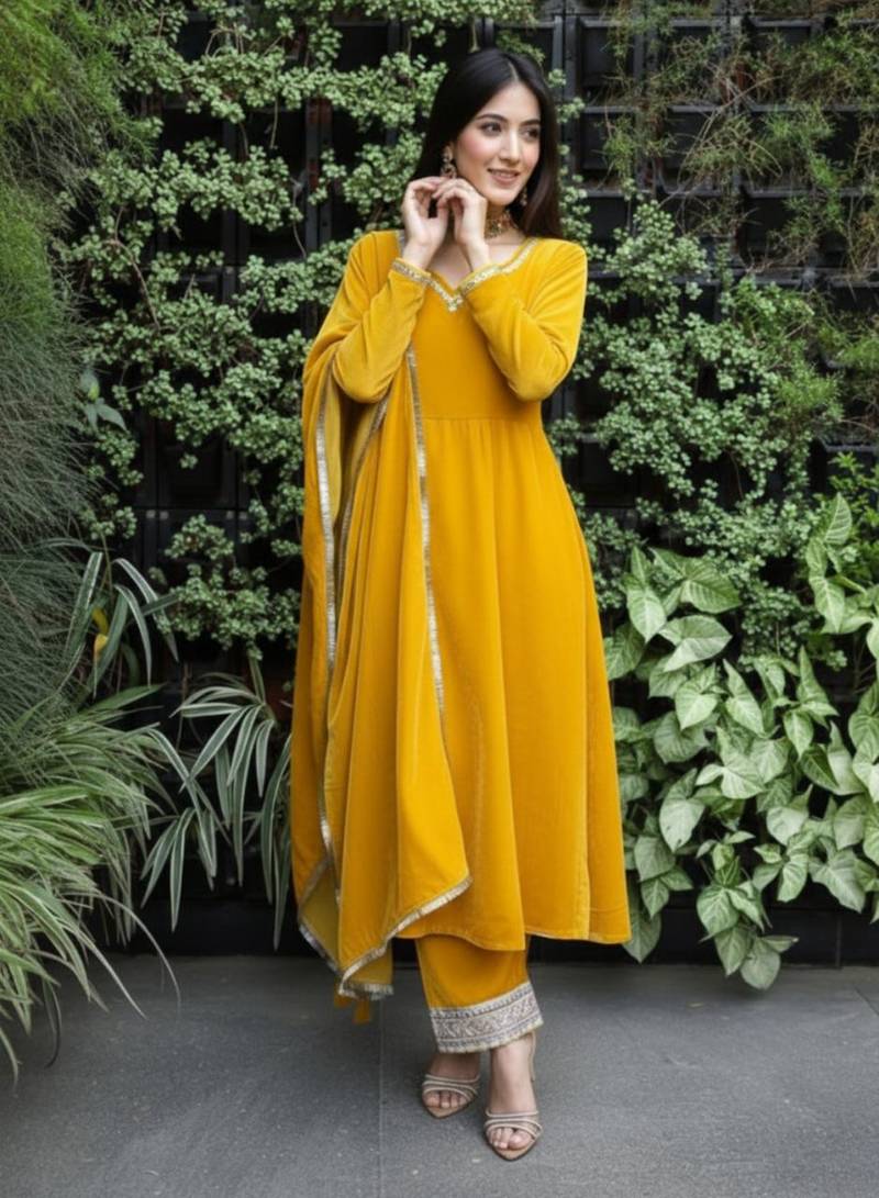 • Product Id : 4675173 • Package Details : 1 Kurta / 1 Pant / 1 Dupatta • Type : Kurta Sets • Fabric : Velvet • Work : Embroidered • Type : Andhra Pradesh Sarees • Sleeve : Full Sleeve • Color : Yellow • Stitching : Stitched Payments [+]